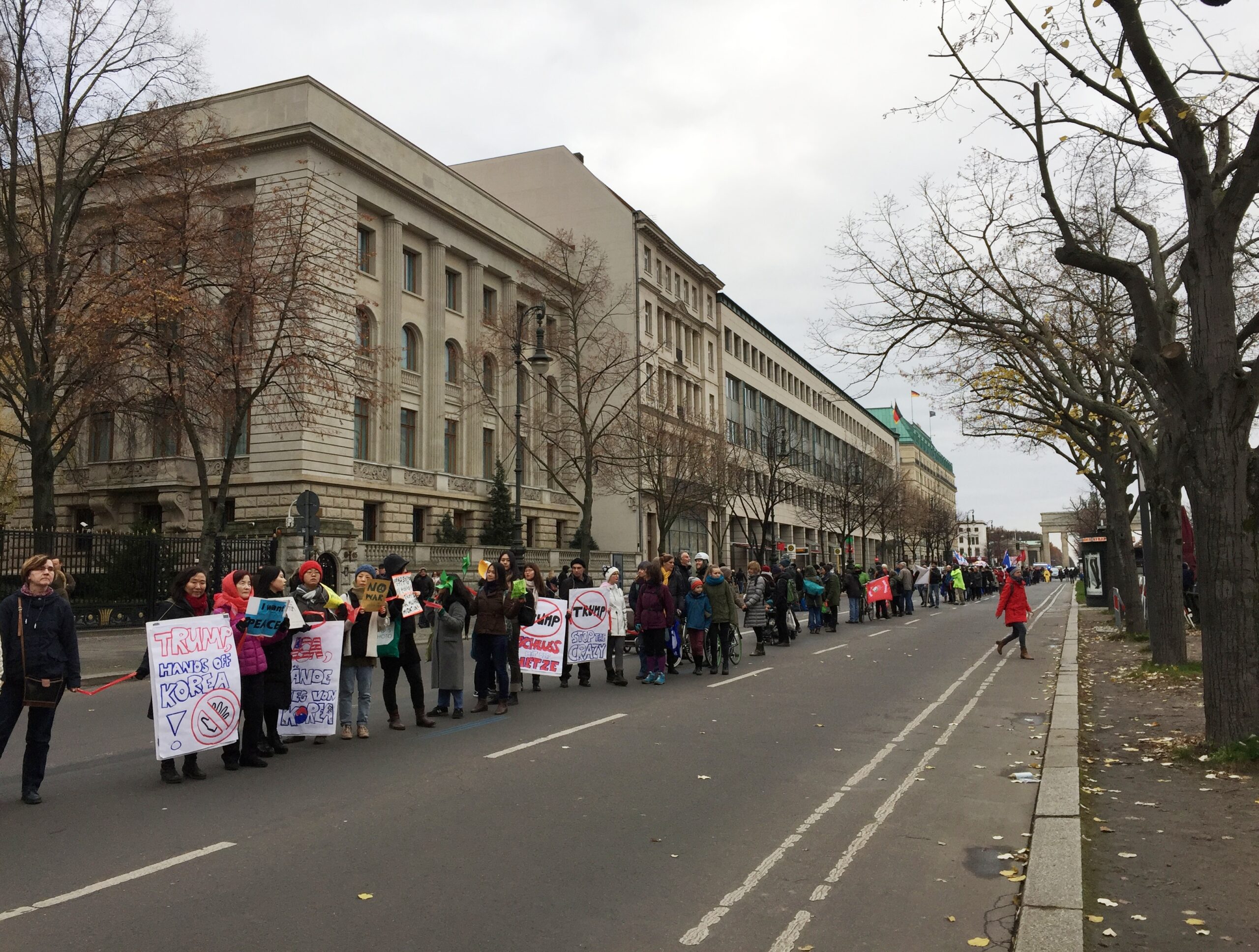 Nach der Wahl Donald Trumps zum US-Präsidenten, herrschte zunächst Unsicherheit, wie dessen Regierung mit Nordkorea umgehen wird. Doch nachdem Nordkorea erfolgreich Interkontinentalraketen getestet hatte, die auch das amerikanische Festland erreichen könnten, eskalierten die Drohgebärden Nordkoreas und der USA. Ein militärischer Konflikt schien unmittelbar bevorzustehen. Der Korea Verband forderte in zahlreichen Interviews und einer Presseerklärung ein Ende der Provokationen und einen Neustart für den direkten Dialog. Wir beteiligten uns zudem an Demonstrationen wie der Menschenkette für Atomwaffenverbot, um die Bundesregierung, die USA und Nordkorea zur atomaren Abrüstung und zur Unterzeichnung des Atomwaffenverbots zu drängen.