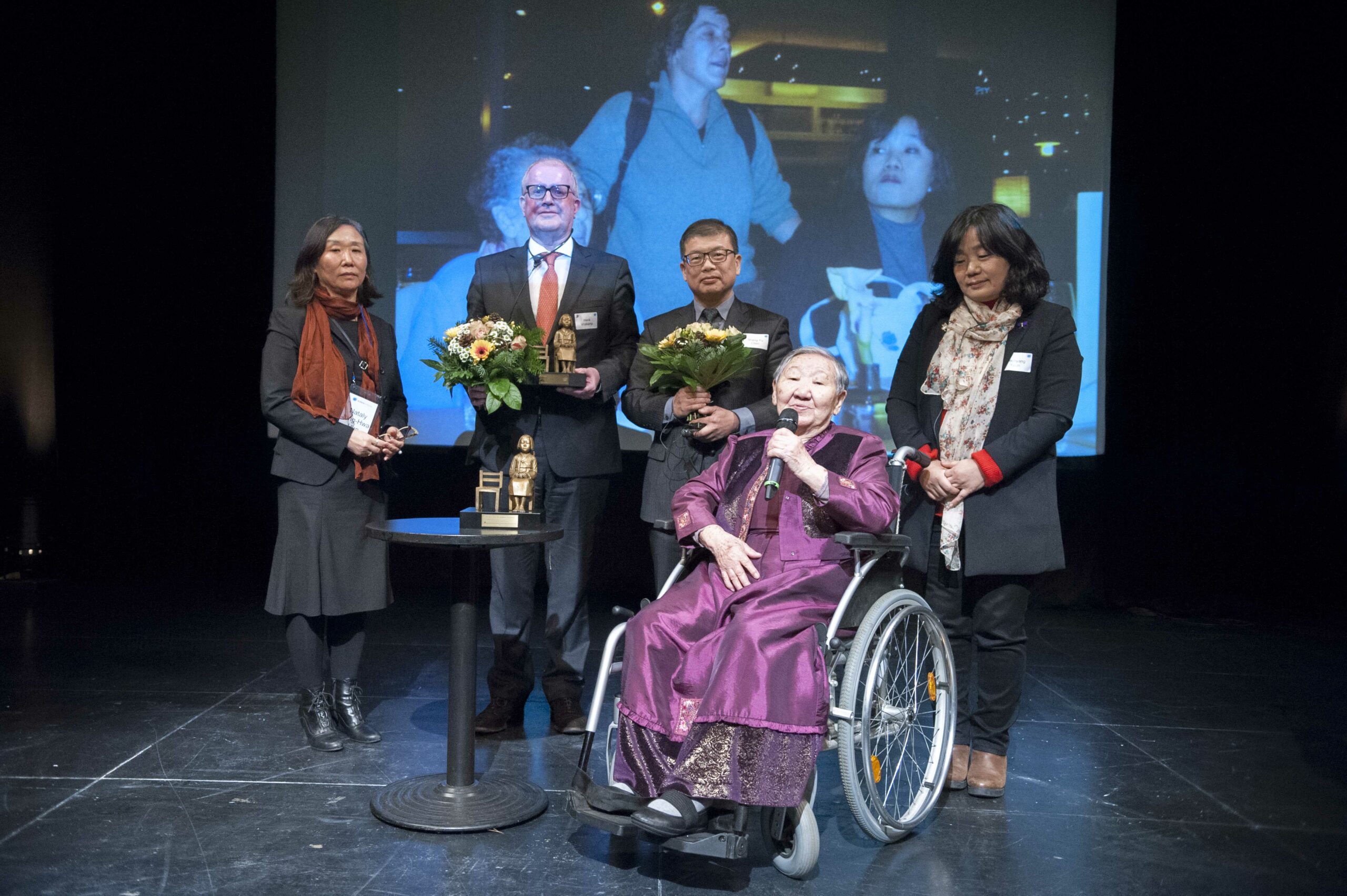 Zum Kirchentag in Berlin luden wir Ende Mai die Überlebende Gil Won-ok ein, um mit Opfern des IS über die Überwindung sexueller Gewalt in militärischen Konflikten zu diskutieren. Dies wurde auch im Rahmen unserer Konferenz „Sexuelle Gewalt in militärischen Konflikten“ am 2. Dezember thematisiert, zu der Gil Won-ok trotz ihres hohen Alters nochmals anreiste. Bei einer Zeremonie würdigte sie sechs Parlamente für ihre Resolutionen zur „Trostfrauen“-Frage. Mit dem Filmmonat „Women’s Bodies as Battlefield“ im November machten wir deutlich, dass es auch außerhalb Koreas viele Betroffene des „Trostfrauen“-Systems gibt.