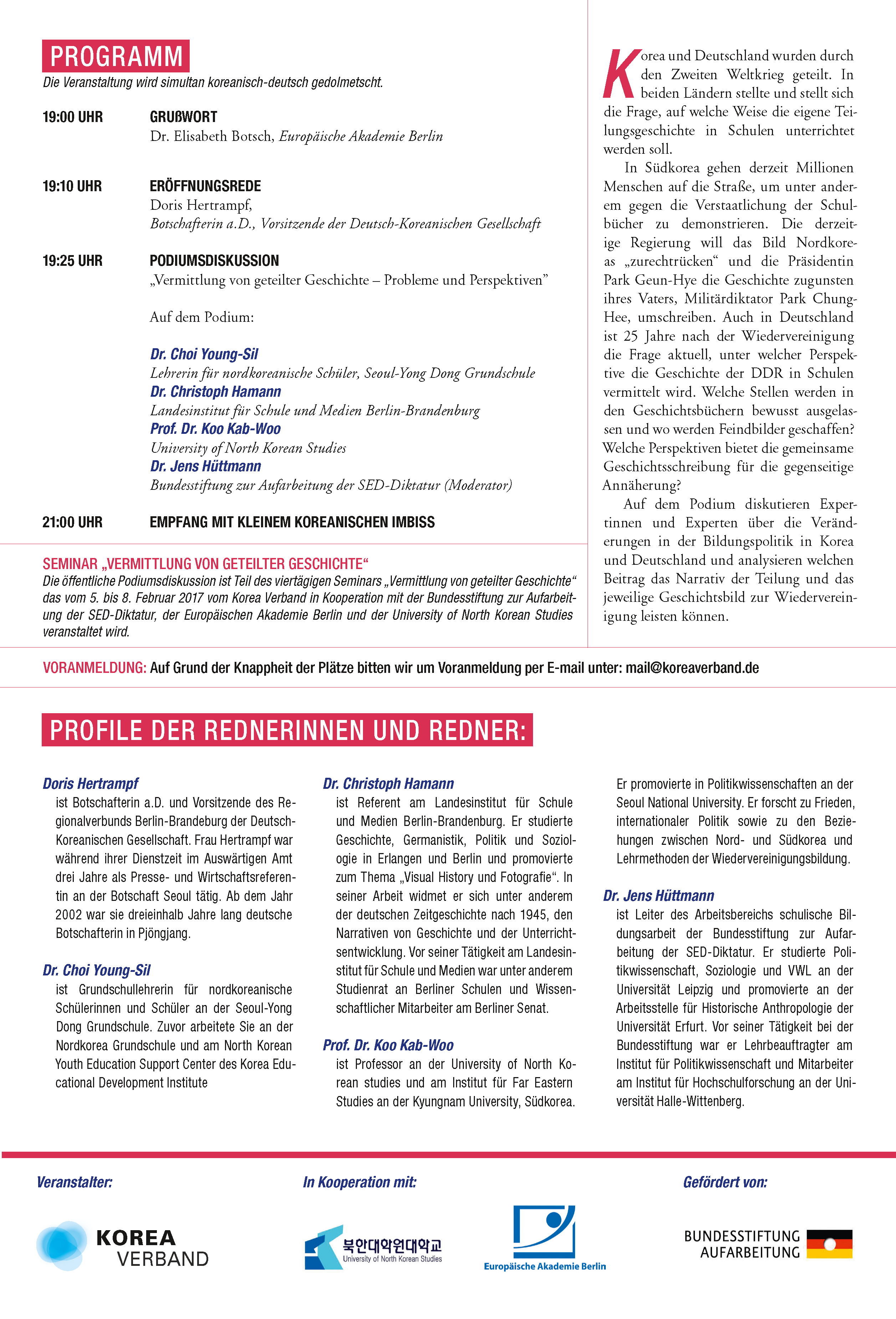 Die öffentliche Podiumsdiskussion ist Teil des viertägigen Seminars »Vermittlung von geteilter Geschichte«, das vom 5. bis 8. Februar 2017 vom Korea Verband in Kooperation mit der Bundesstiftung zur Aufarbeitung der SED-Diktatur, der Europäischen Akademie Berlin und der University of North Korean Studies veranstaltet wird.